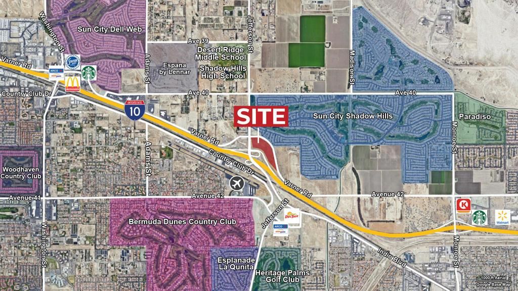 Potential for 10 to 12 acres to be entitled for Multi-Family up to 20 units/acre. Located at the I-10 and Jefferson Offramp with three signalized entrances to the project. Approved site plan for retail. This is the main freeway exit for the Coachella and Stagecoach Music Festivals. 3 miles to the new Coachella Valley Stadium/Arena. Within 1 mile from Shadow Hills High School and Desert Ridge Middle School and a new elementary school coming soon. Indio is one of the fastest-growing cities in the Coachella Valley. Known as the City of Festivals, it welcomes more than 1 million visitors each year. Drive Thru pads available. This area is experiencing explosive new growth. We cannot guarantee the accuracy or square footage, lot size or other information concerning the condition or features of property provided by the Seller or obtained from public records or other sources. The Buyer is advised to independently verify the accuracy of all information through personal and professional inspections.