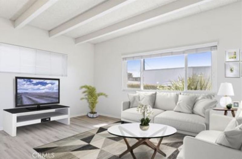This is the one you have been looking for. The open floor plan of this front unit features a spacious living room drenched in the sunshine pouring through the windows. Adjacent to the breakfast nook is the cook's kitchen with granite countertops and lots of cabinet space. Everyone will be inspired to cook and entertain. Two spacious bedrooms are down the hall each with two sets of closet. Between the bedrooms is a full bathroom. Brand new vinyl laminate has been installed in the living room, hallway and both bedrooms. Enjoy the ocean breeze from the landscaped front yard suited for evening conversation and sunbathing. The private car garage has a new garage door and 1 parking spot with storage. Shared laundry with unit B and C. With no one living underneath you or above you- this feels like a single family home. Fabulous location close to shopping, restaurants and Huntington beach. Property is available for immediate move in. Don't wait to make this house your home.